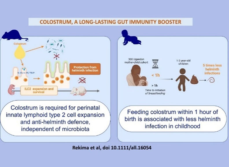 Helminth infection: In a unique preclinical model of colostrum deprivation, we demonstrated that colostrum is essential for the expansion of key immune cells in the gut—type 2 innate lymphoid cells (ILC2s)—which are critical for controlling helminth infections Rekima et al (2024).. In a proof-of-concept birth cohort in Uganda, we further found that providing newborns with the first drops of colostrum was associated with a significant reduction in helminth infections during childhood (Rekima et al., 2024). Globally, more than 1.5 billion people—approximately 25% of the world’s population—are infected with soil-transmitted helminths. Infected children often suffer from nutritional deficiencies, stunted growth, and impaired cognitive and physical development, with profound societal and economic consequences.