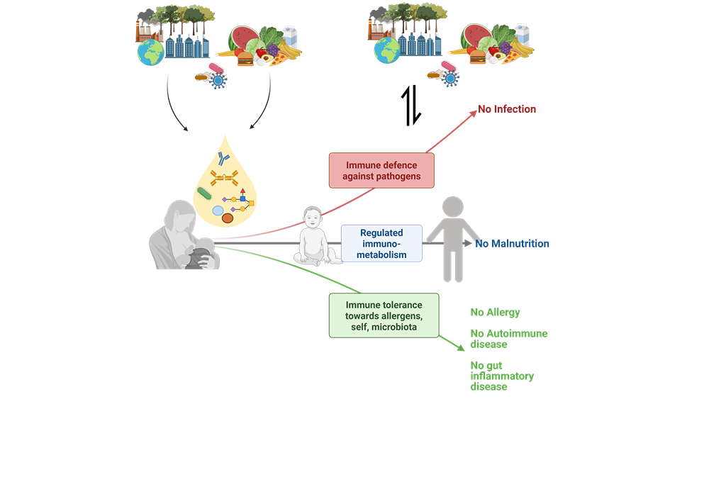 Beyond complementing the infant’s immune system, breast milk plays an active role in educating it. It shapes the infant’s gut microbiota by contributing to its initial seeding and by providing selective nutrients that support beneficial microbial growth. Breast milk also contains environmental antigens—derived from allergens and pathogens present in the maternal–child environment. We are investigating how antigen shedding via breast milk helps train the infant’s immune system to mount appropriate future responses: promoting tolerance toward allergens and effective defense against pathogens. This immune education is further modulated by a range of bioactive compounds in breast milk whose composition is influenced by the mother’s physiology and environment. Altogether, this supports the broader concept that breast milk reflects the maternal exposome and prepares the infant for life in their specific environment.