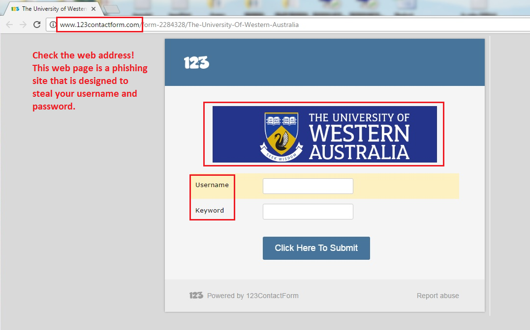 For some specific examples of bad sites used in recent email phishing attacks sent to UWA staff and students, which are designed to steal personal information, refer to the University IT phishing info page.