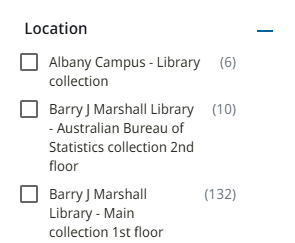 The Albany Library collection is housed on the UWA Albany Campus and items are listed in OneSearch. Search for your topic, and then use the Location filter (found under the All Filters menu) to limit your results to the Albany Campus collection: