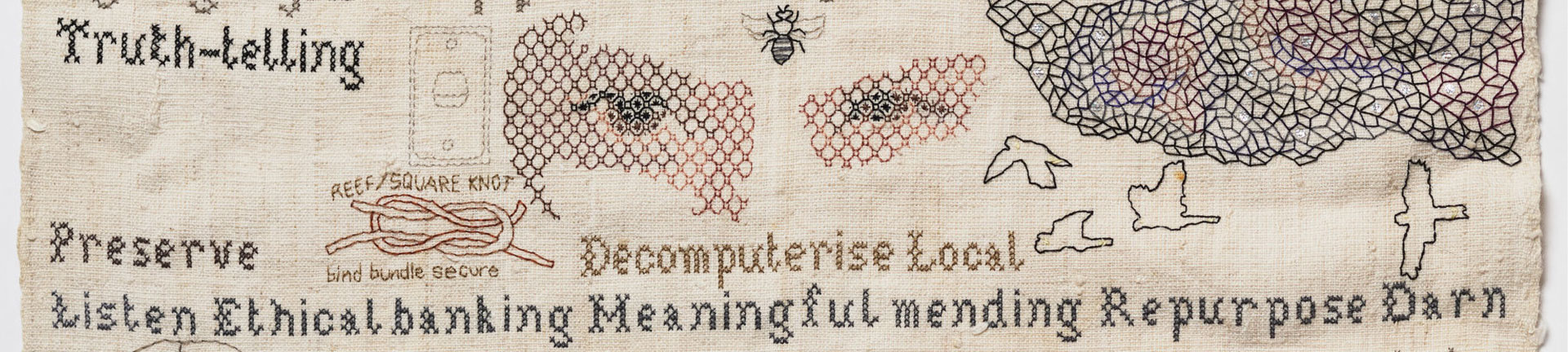 Image: Sera Waters, Survivalist sampler (detail), 2019-2020, cotton, glow-in-the-dark thread,found materials on re-purposed linen, 45 x 42cm, Cruthers Collection of Women's Art, Gift of Sheila Foundation Limited 2022, © Courtesy of the artist.