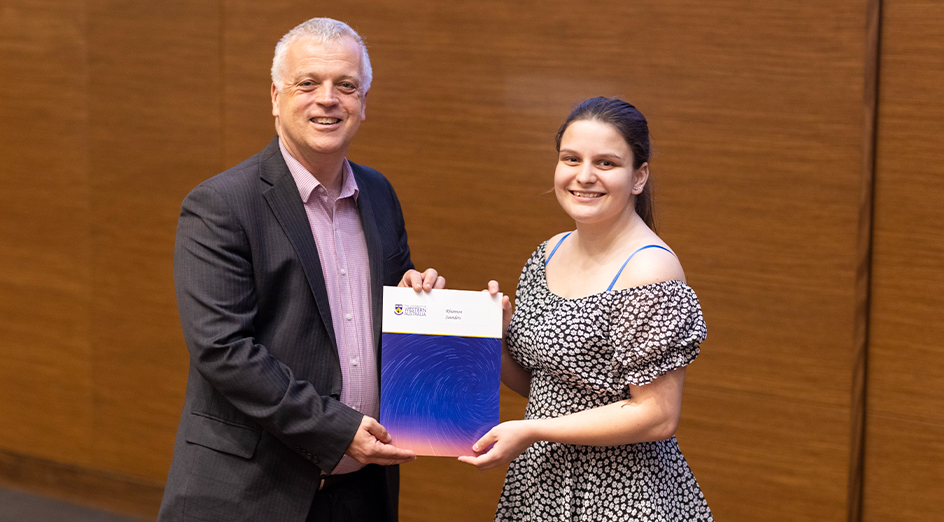 Image: Rhiannon Saunders accepts her certificate from Professor David Sadler.