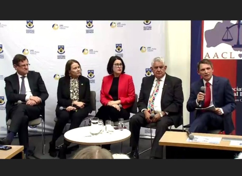 UWA Law School, the UWA Public Policy Institute and the Australian Association of Constitutional Law co-hosted a panel discussion on ‘The Voice to Parliament: Constitutional and Legal Implications for Australians’ on Wednesday 30 August 2023 in the Wesfarmers Lecture Theatre at UWA Business School. The panel consisted of the Hon Ken Wyatt AM, the Hon Robert French AC (LLB ’71), Law School lecturer Aurora Milroy, and Kim Farmer (LLB ’02), Principal Lawyer at Farmer Legal. Law School Associate Professor Murray Wesson chaired the panel.