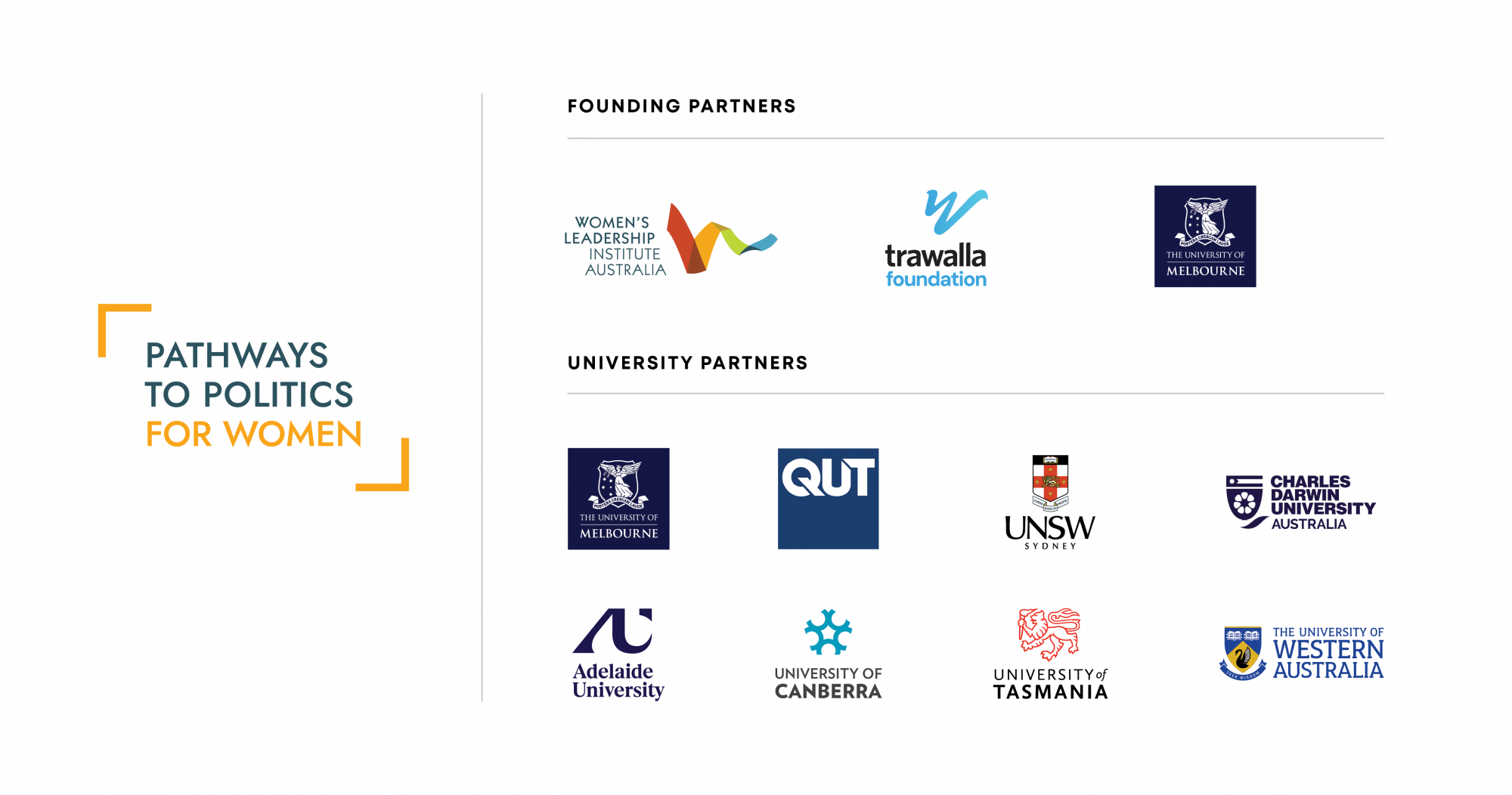 The foundational Pathways to Politics program launched at the University of Melbourne in 2016, followed by programs at QUT in 2019, UNSW in 2021, Charles Darwin University in 2022, the University of Adelaide and University of Canberra in 2023, and the University of Western Australia and University of Tasmania in 2024.