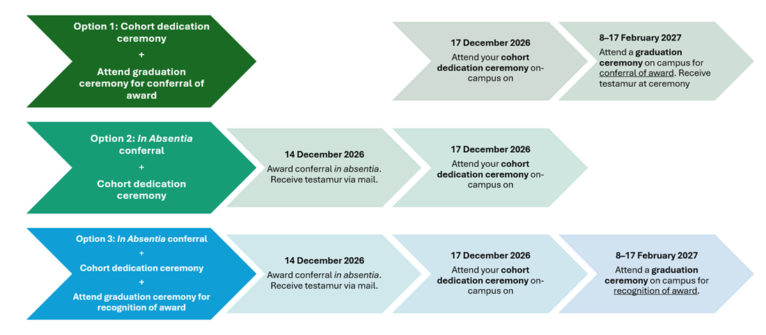 • Option 3 – Graduate in absentia in December 2026 and attend a Graduation Ceremony for recognition in February 2027