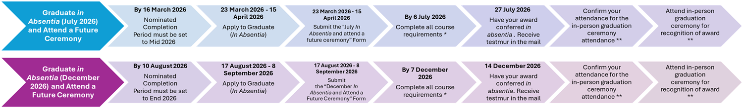Students who complete their course by the in absentia completion deadline in July and December, and graduate in absentia in July and December respectively, may attend a future in-person ceremony within two years of completing their course, provided they meet the eligibility criteria.